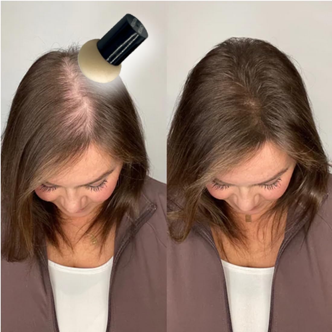 - BALD SPOT Thinning Hair INSTANT COVER UP Powder also conceals thinning hair and hair loss, bald areas get covered and hidden right away for an instant look of healthy volume. Packaging includes a large mirror and a great mushroom applicator. Root touch up powder is rain, sweat, and wind resistant, but washes out with your next shampoo. fill in brows and thinning hairlines; powder compact perfect for on-the-go touch ups, lasts many uses